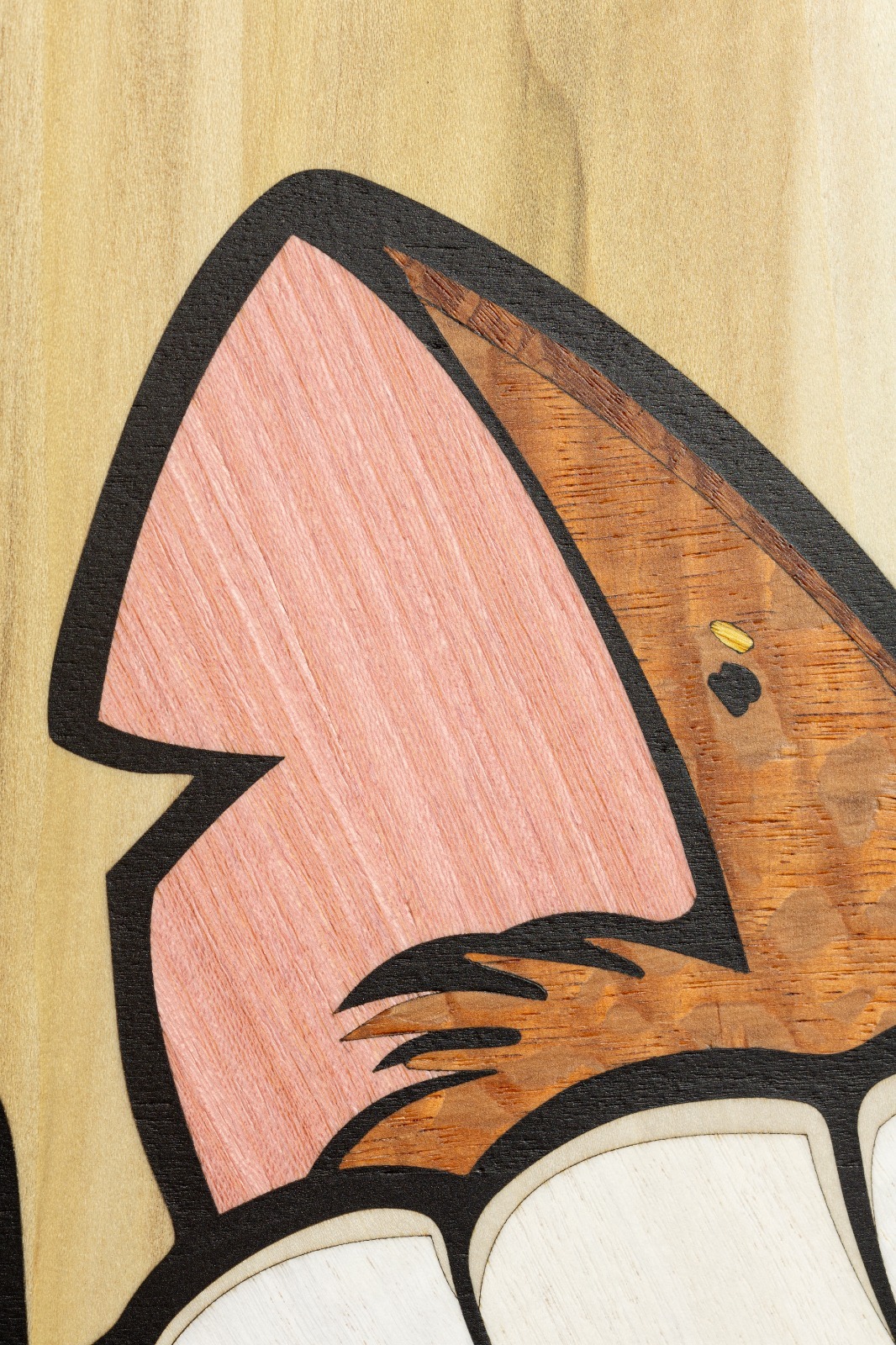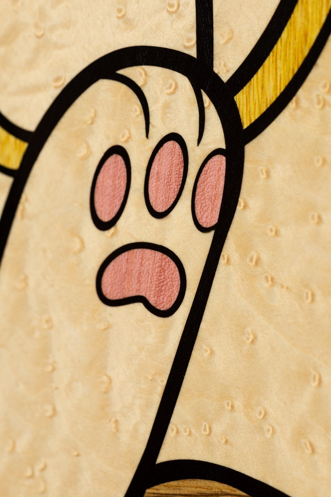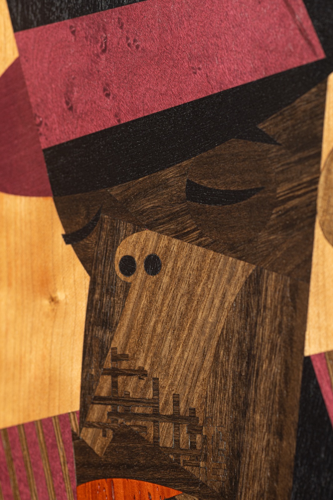 ОПИСАНИЕ Иллюстративная композиция с выразительным персонажем и детализированными элементами создаёт эффект живой, тёплой сцены. Многообразие пород шпона позволяет передать богатство цветовых переходов и фактур, а ручная подгонка элементов формирует чёткий и аккуратный рисунок. Панно наполняет пространство лёгким юмором и уютом.