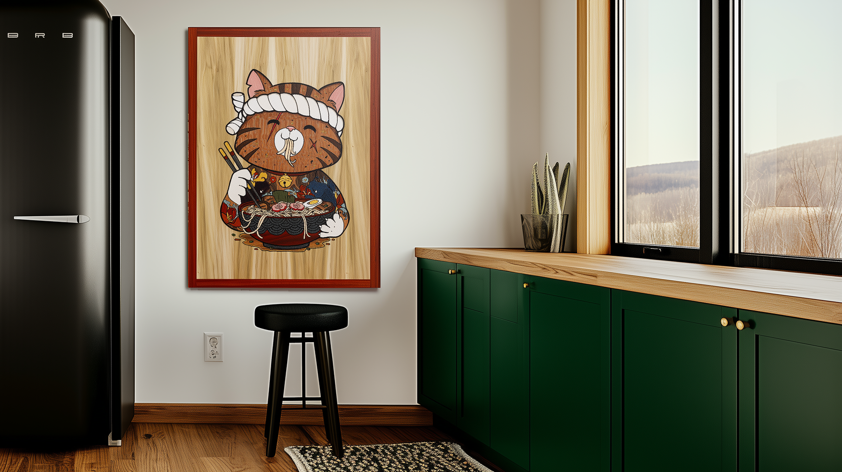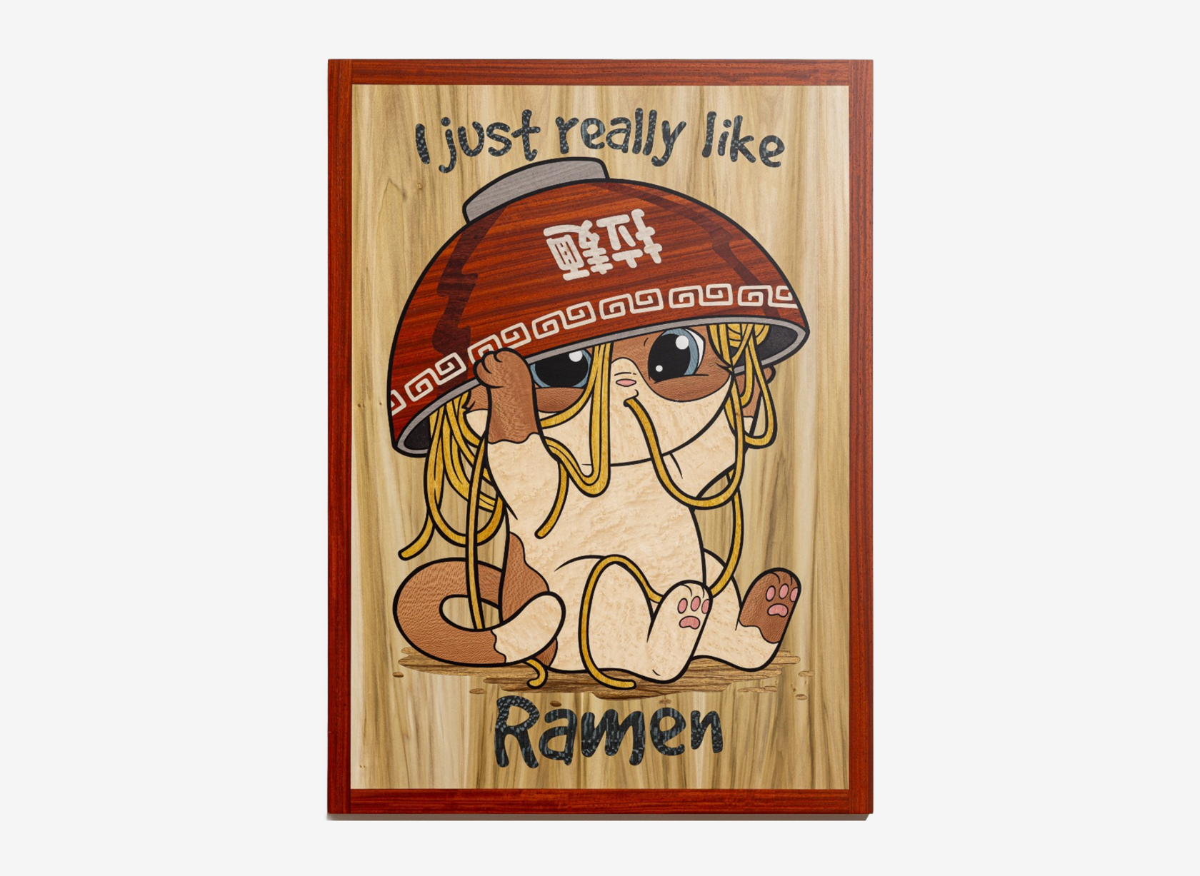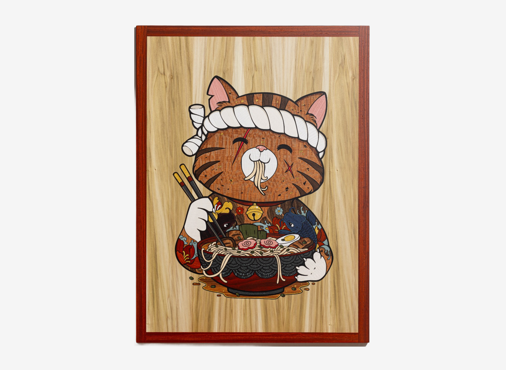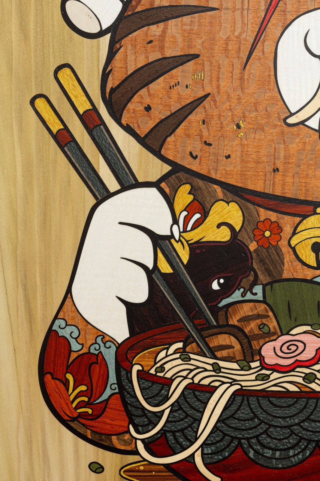 ОПИСАНИЕ Иллюстративная композиция с выразительным персонажем и детализированными элементами создаёт эффект живой, тёплой сцены. Многообразие пород шпона позволяет передать богатство цветовых переходов и фактур, а ручная подгонка элементов формирует чёткий и аккуратный рисунок. Панно наполняет пространство лёгким юмором и уютом.