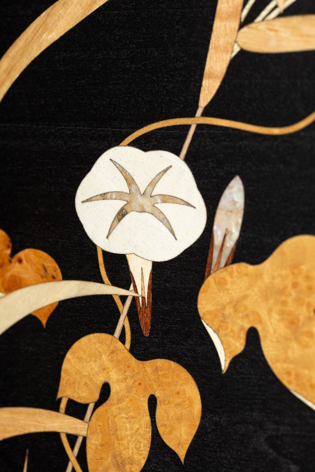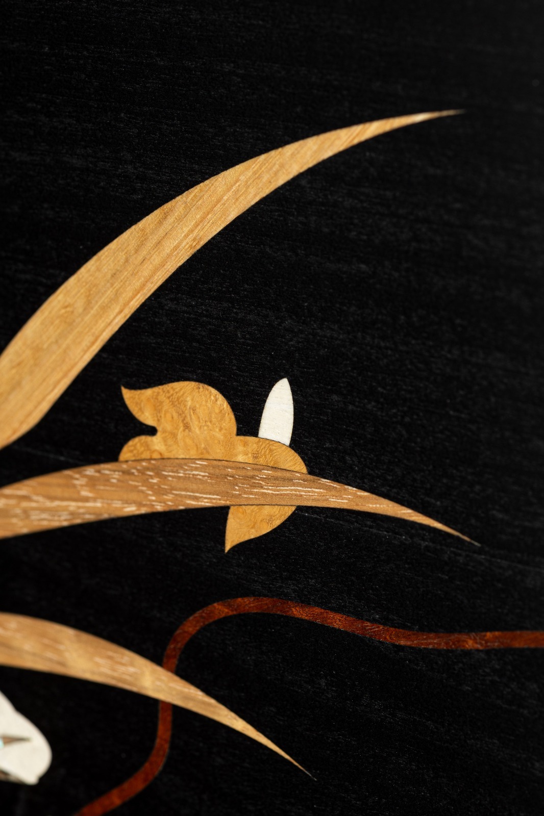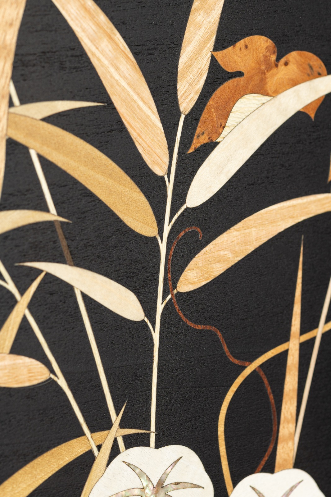 ОПИСАНИЕ Вертикальная композиция в стиле шинуазри сочетает декоративность восточных мотивов с природной выразительностью древесных текстур. Детализированная инкрустация формирует сложный орнаментальный рисунок, создавая ощущение глубины и движения. Панно становится изысканным художественным акцентом и задаёт характер всему пространству.