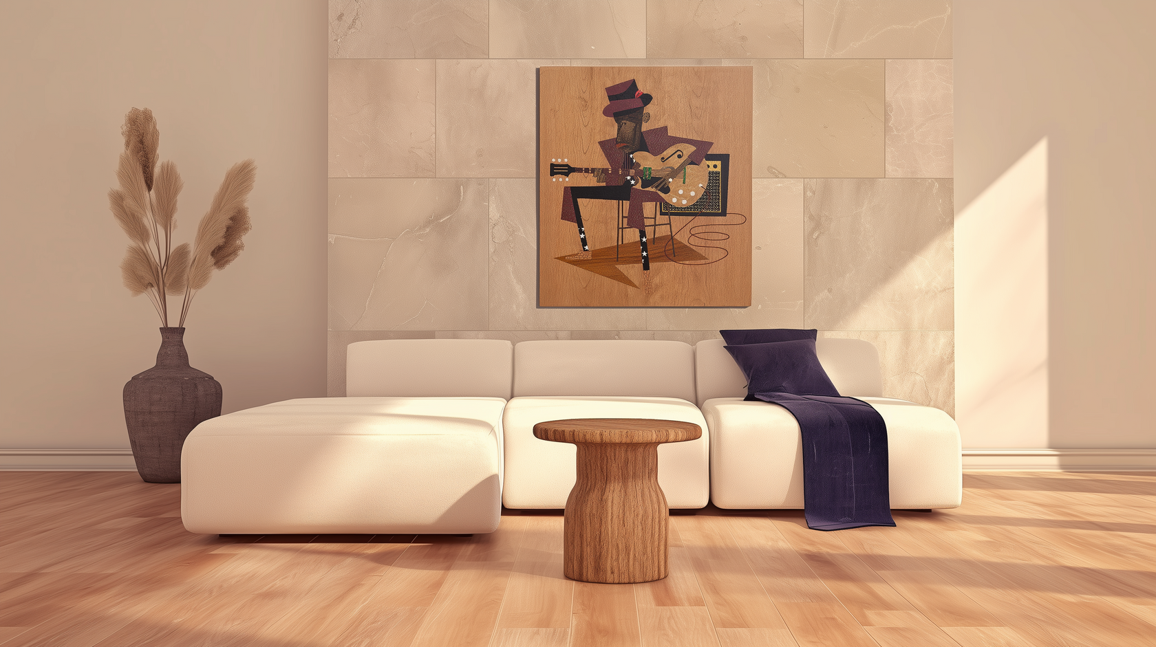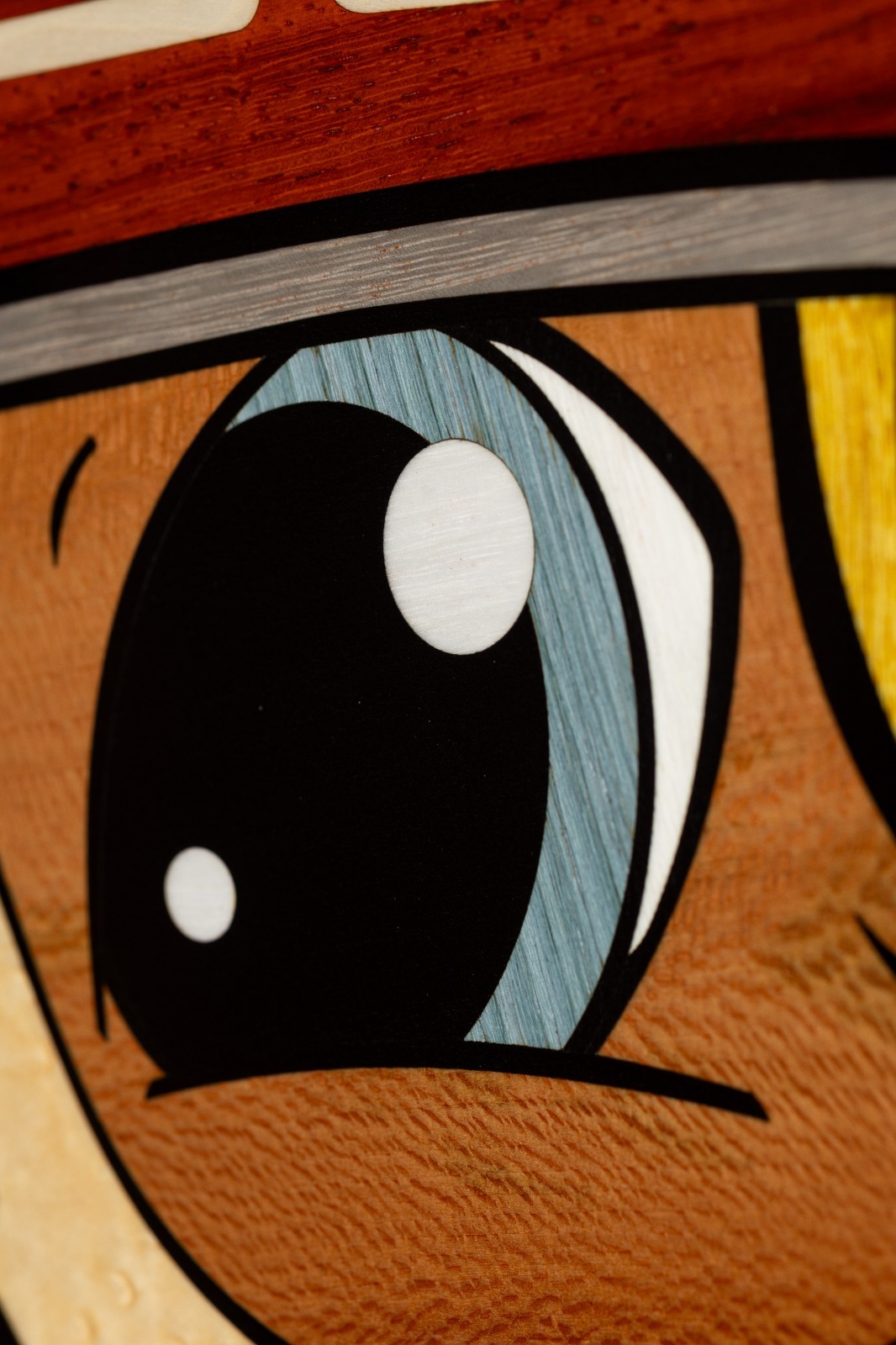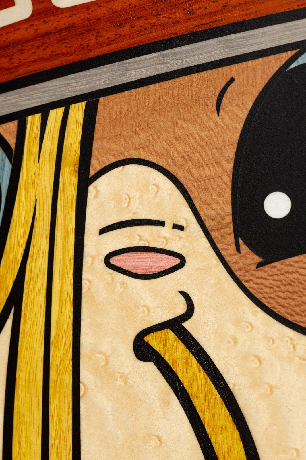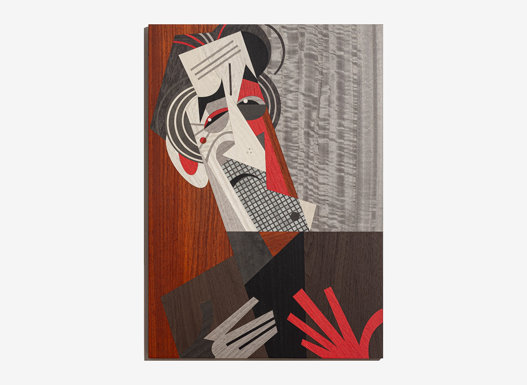ОПИСАНИЕ Яркий персонажный образ выполнен в стилистике современной иллюстрации с акцентом на декоративность и цвет. Контрастные породы шпона и сложная мозаика создают насыщенную, динамичную композицию, которая привлекает внимание и вызывает эмоциональный отклик. Панно становится выразительным арт-объектом в интерьере.