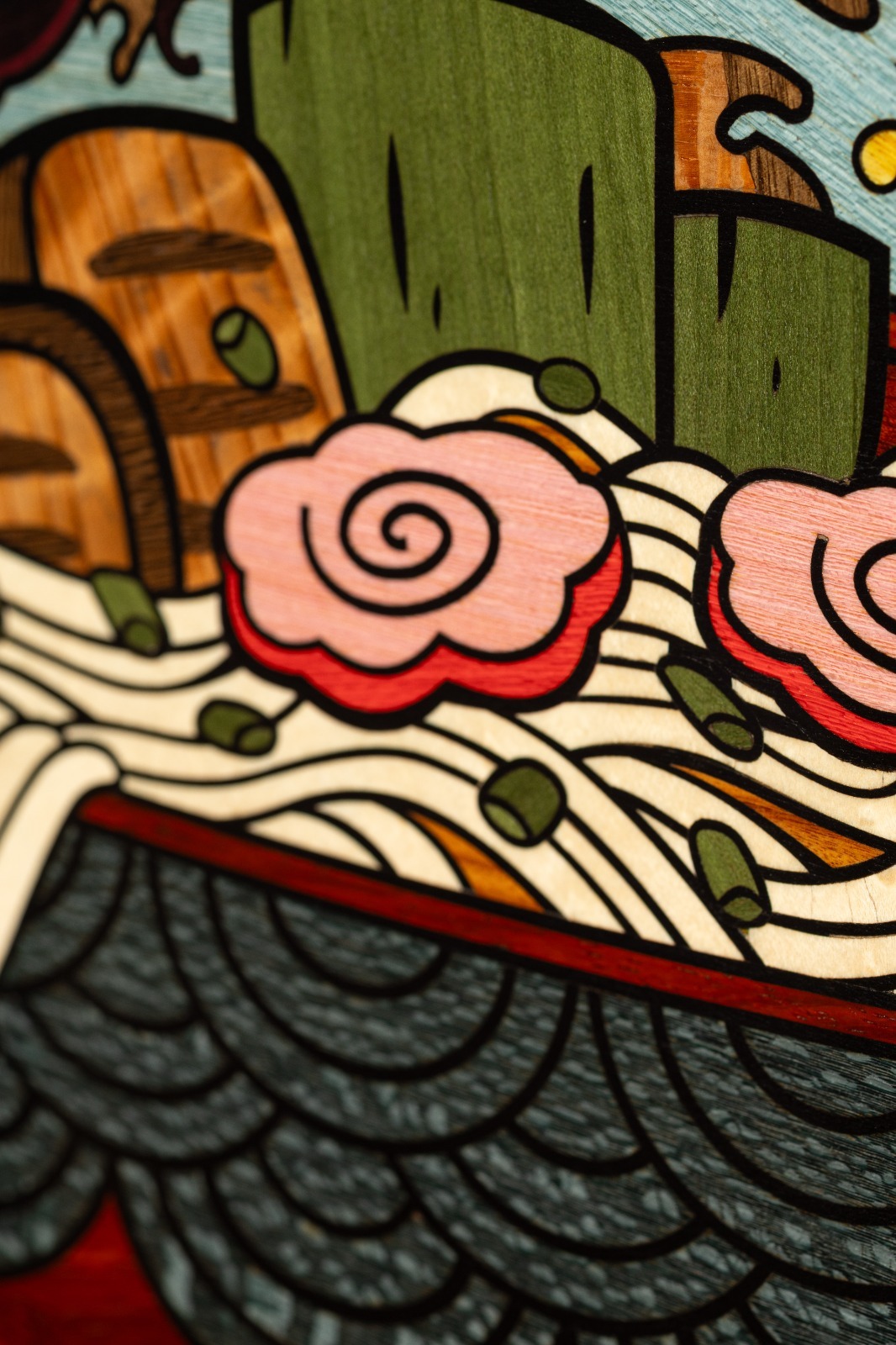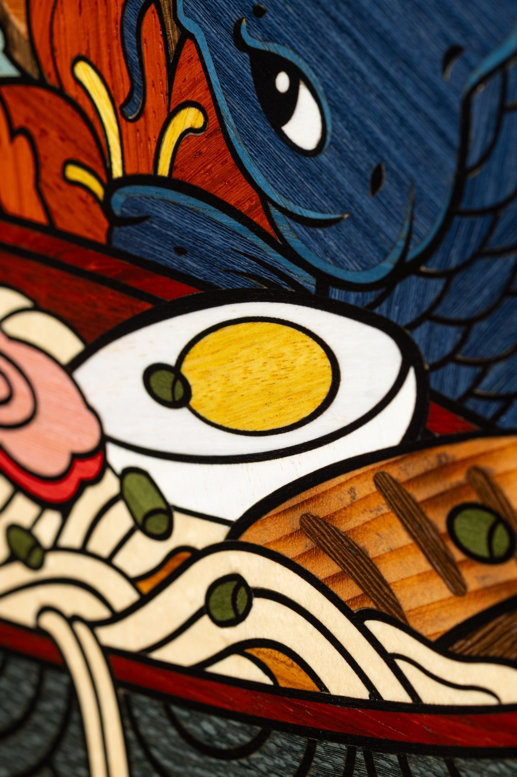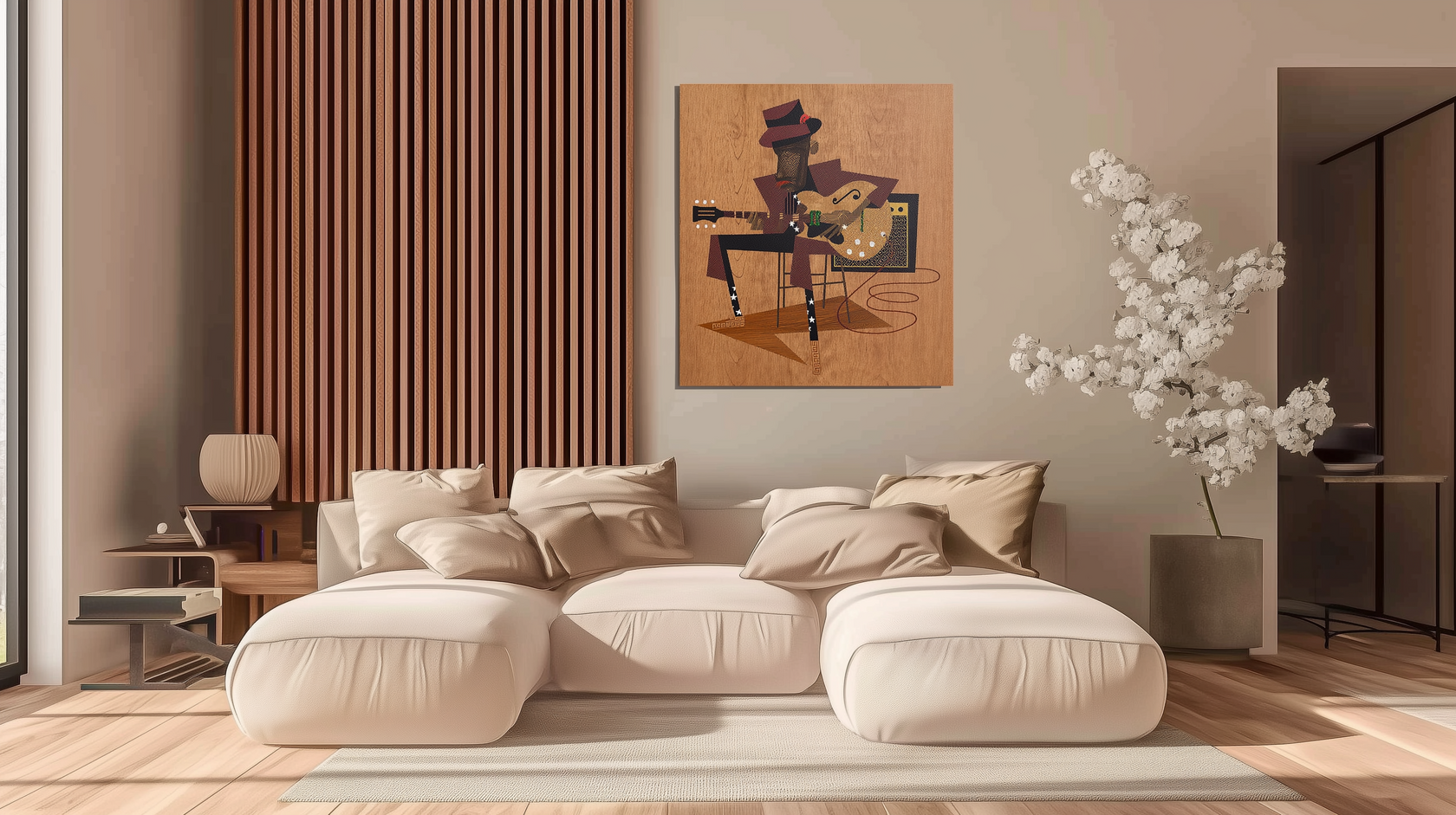 ОПИСАНИЕ Яркий персонажный образ выполнен в стилистике современной иллюстрации с акцентом на декоративность и цвет. Контрастные породы шпона и сложная мозаика создают насыщенную, динамичную композицию, которая привлекает внимание и вызывает эмоциональный отклик. Панно становится выразительным арт-объектом в интерьере.