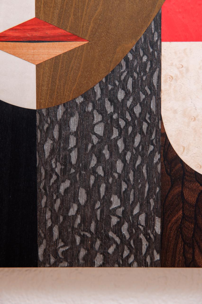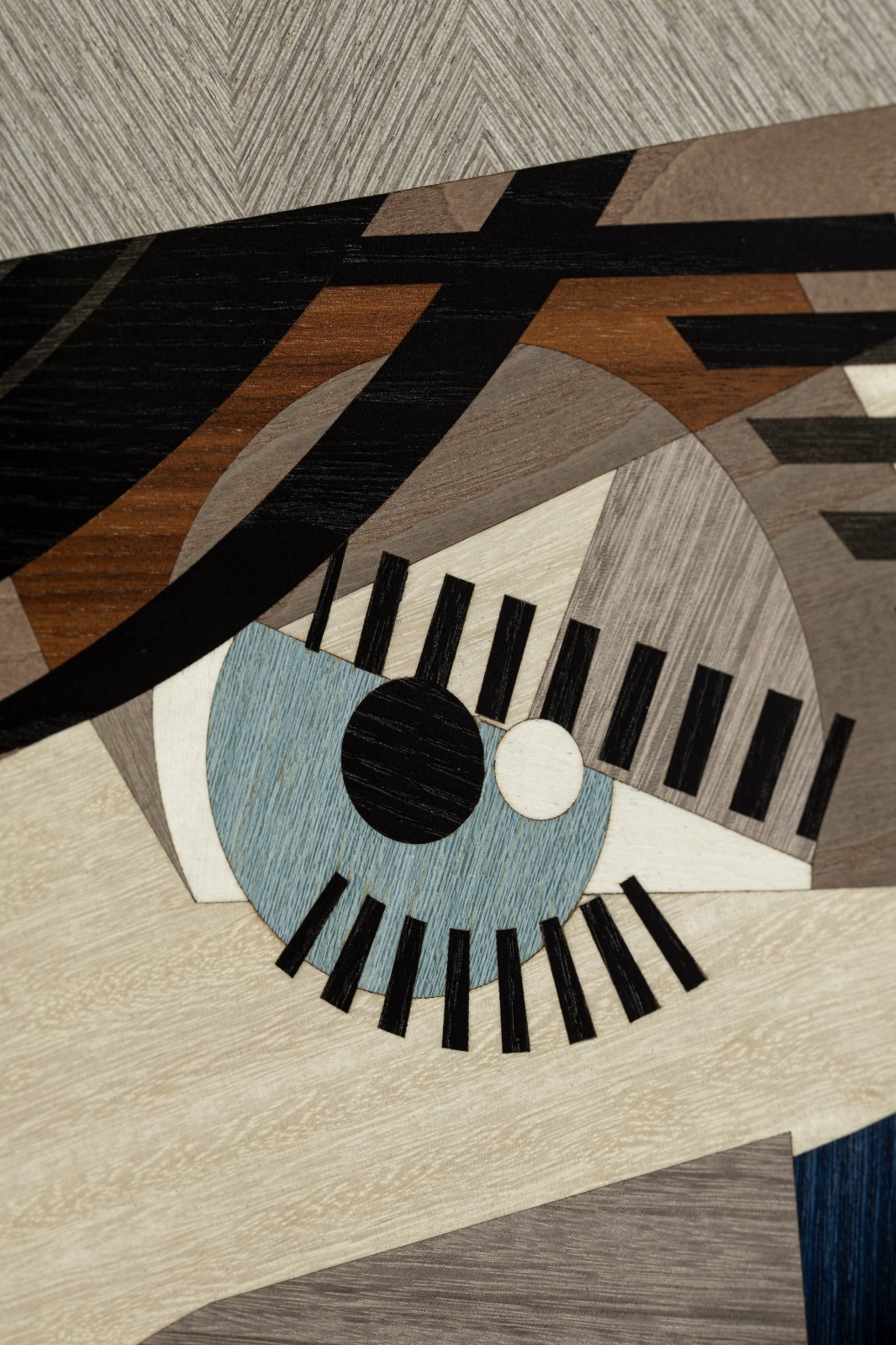 ОПИСАНИЕ Панно выполнено в стилистике современной геометрической иллюстрации. Сюжетная композиция, выполненная в стилистике графического портрета, создаёт эффект выразительного художественного кадра. Контраст пород шпона формирует чёткие силуэты и глубину изображения, а насыщенные акценты придают работе эмоциональную выразительность. Панно отсылает к эстетике авторской иллюстрации и современного арт-постера.